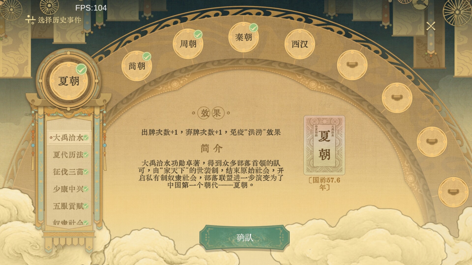 6、游戏会根据玩家的单局进度,换算成每个朝代的国祚,玩家最佳记录将保存在【选关页面】的对应历史事件当中;
