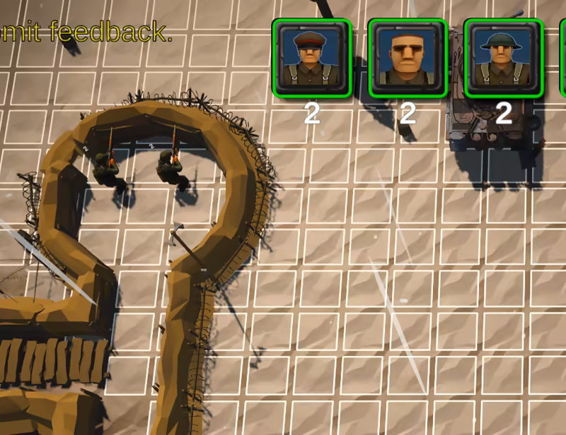 Gameplay: You control 5 types of units - Captain, Private, Sniper, Medic and Mortar support. Each unit has a specific set of abilities that you need to utilize in order to clear a map. All units have 2 ability points per turn and various move distance, ranges and special abilities.