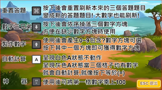 進入對決後,查看右方敵人後面的圈圈數字,那三個數字(或是2個或是1個),就是你要答題的答案,下方的格子是你的算是建構,從左方選擇你需要的數字,將整個算式成立,即可答題成功,讓對方少一個心.