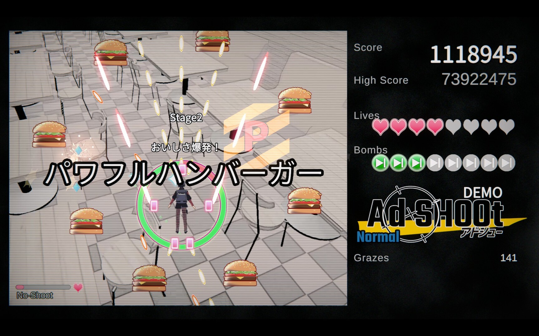 架空の広告を撃ち落とす2D縦スクロール弾幕シューティングゲーム。体験版は3ステージ/全7ステージ中。