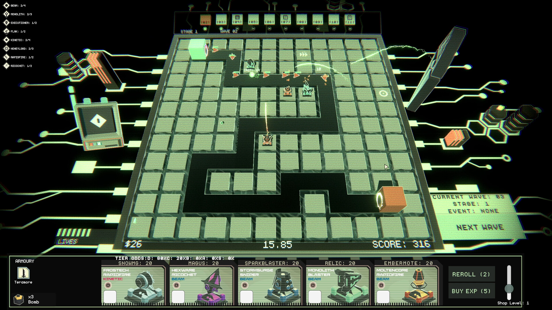 Survive Ninety Nine waves. Build a board of towers from different manufacturers with varied abilities, equip them with Mods and Buddies and plan ahead to deal with enemy-buffing weather forecasts.
