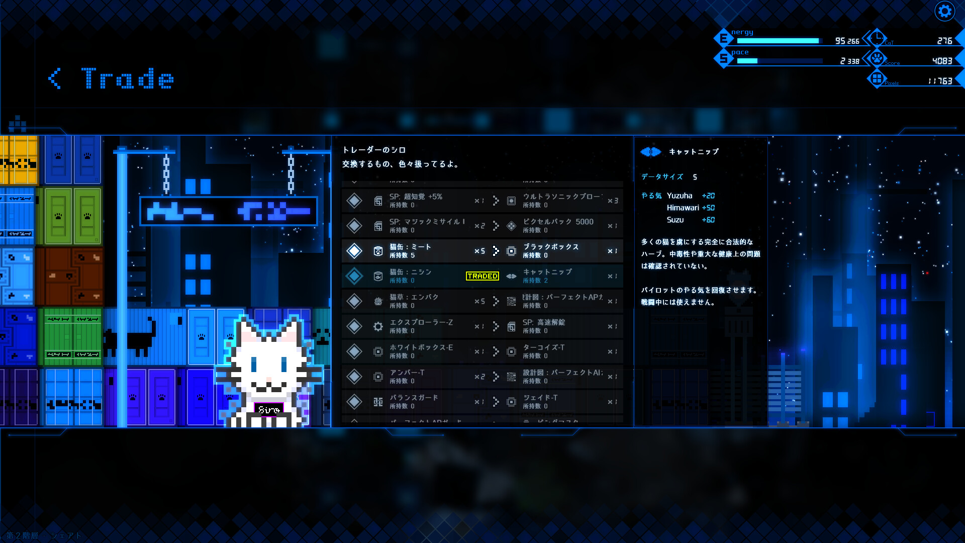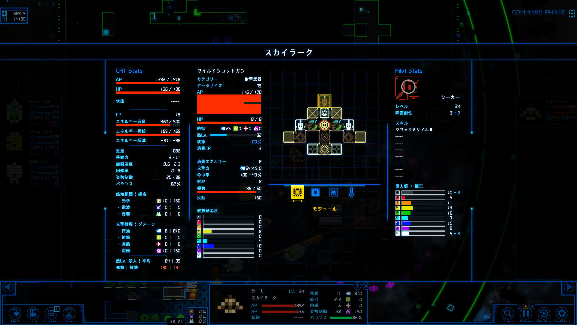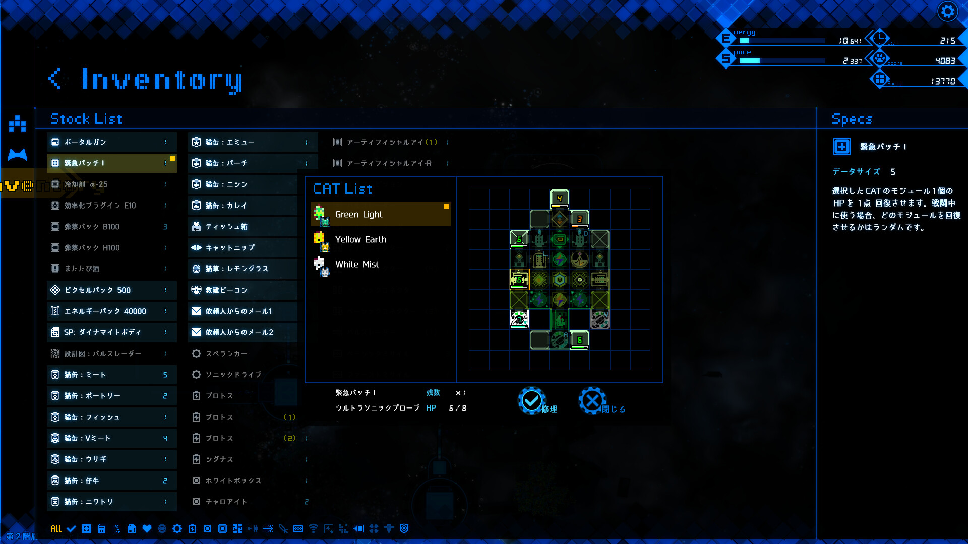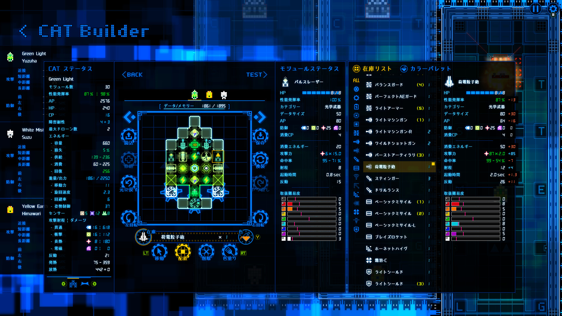 CATと呼ばれるこのマシンは自由に部品を換装可能な構造になっている。必須なのはただ1つのコアモジュールだけ。あなたのオリジナリティを発揮しよう。パイロットである猫たちには得意・不得意があることを忘れずに。
