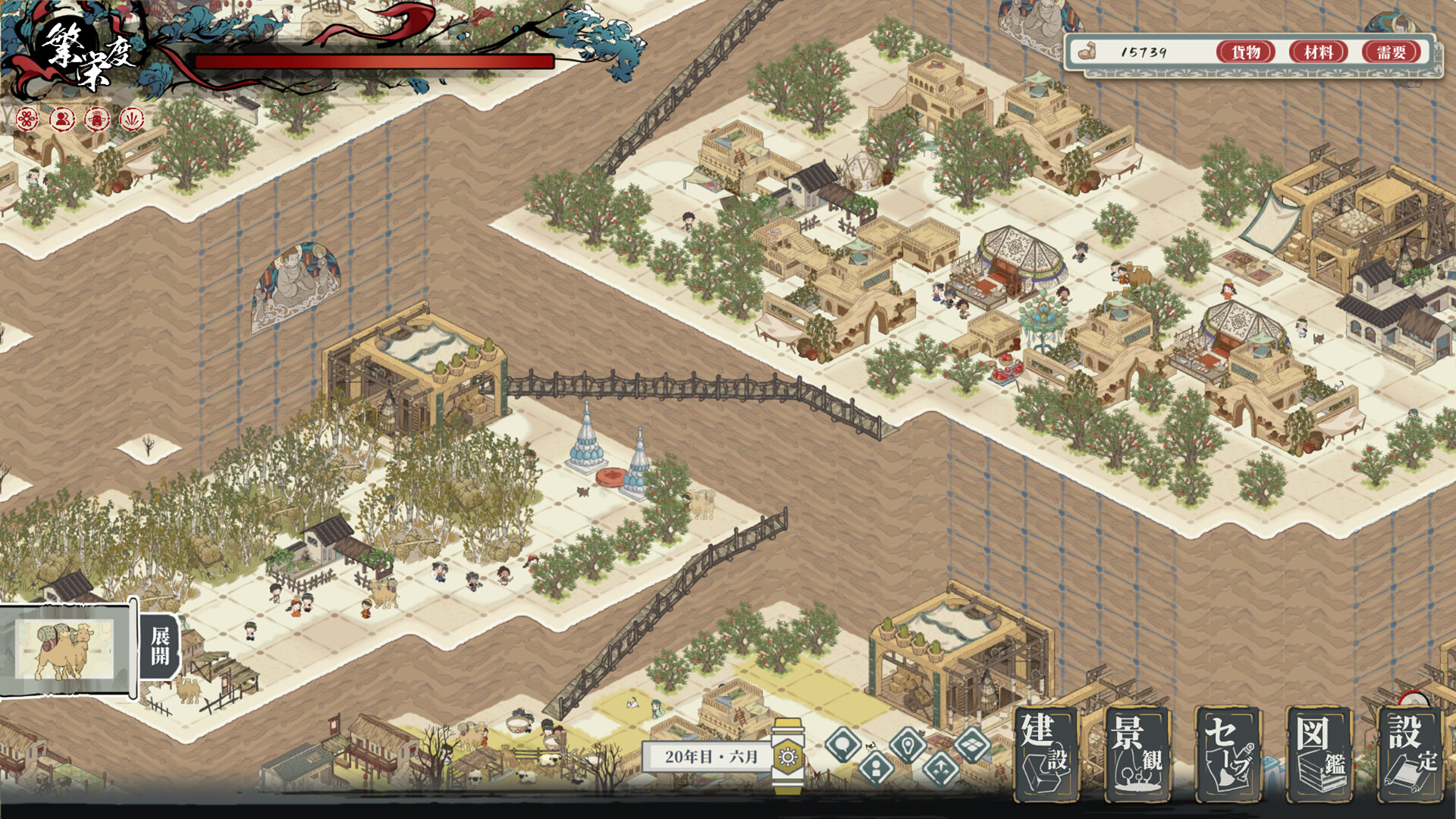 通常の資源生産以外に、ここで宿場やラクダの行商隊を作り、東西の町と貿易関係を築く必要がある。行商を成し遂げ、貴重な物資を持ち帰って町を発展させよう。