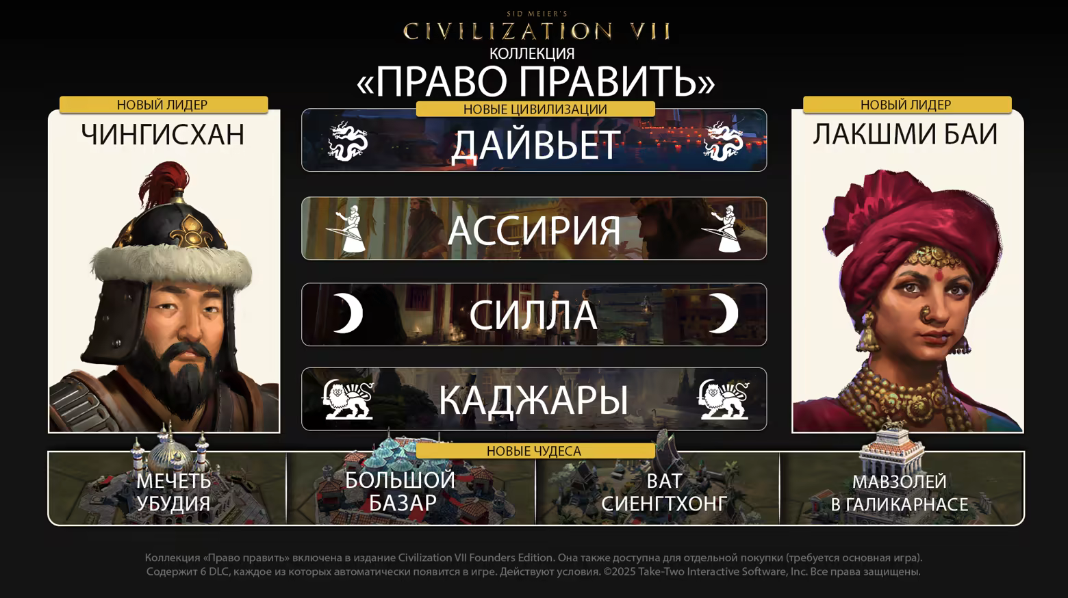 *Требуется базовая игра. Коллекция «Право править» включена в Civilization VII Founders Edition (более не доступна для покупки с 28 февраля 2025 года).