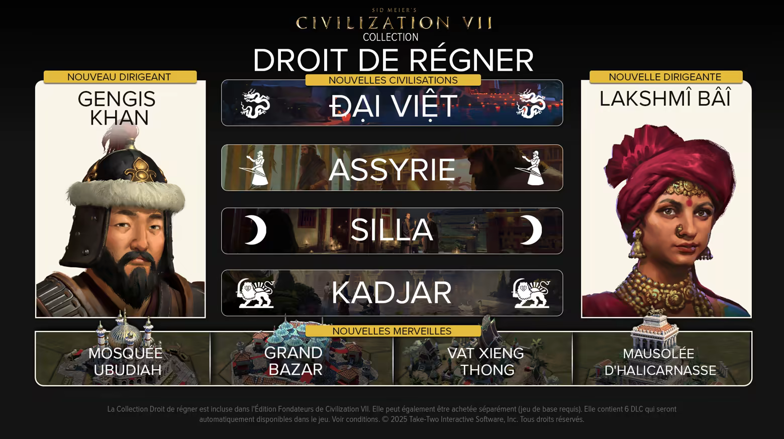 *Jeu de base requis. La collection Droit de régner était déjà incluse dans Civilization VII Édition Fondateurs (plus disponible à l’achat depuis le 28 février 2025).