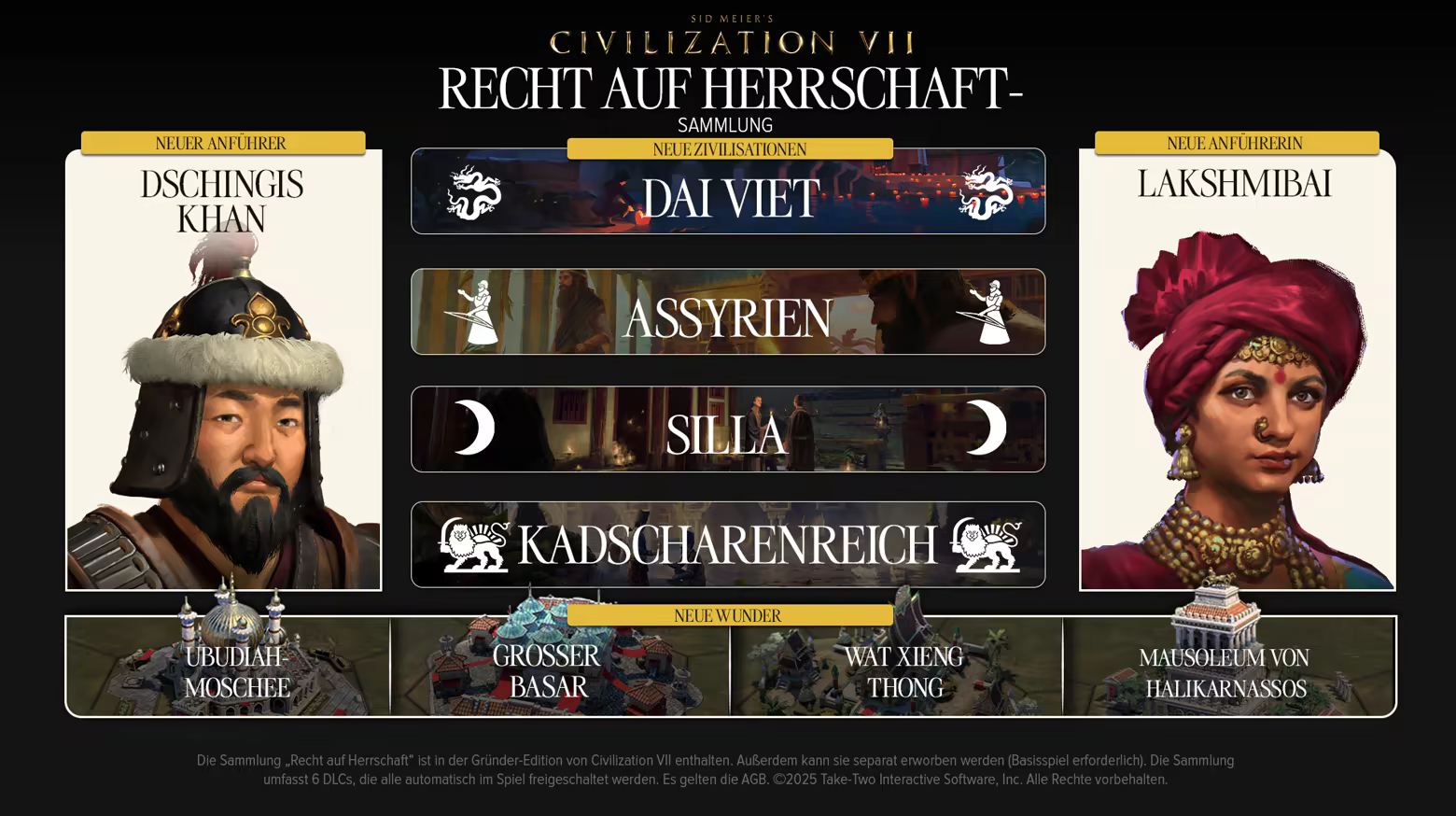 * Basisspiel erforderlich. Die Recht auf Herrschaft-Sammlung ist bereits in der Civilization VII Gründer-Edition enthalten (diese kann jedoch seit dem 28. Februar 2025 nicht mehr gekauft werden).