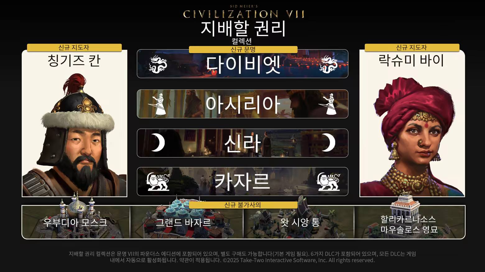 *기본 게임이 필요합니다. 지배할 권리 컬렉션은 문명 VII 파운더스 에디션에 이미 포함되어 있습니다(2025년 2월 28일부로 더 이상 구매 불가).