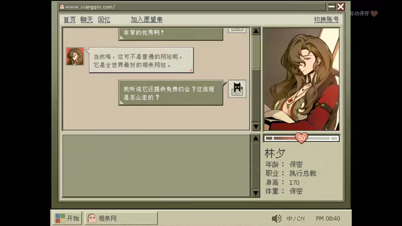 This is a text-based adventure horror & humor game. You are a restless college student who is lured into dangerous encounters with ghost women, murderers, and other supernatural beings through the enigmatic matchmaking site. You need to survive, making them blush, and let them fall in love with you.