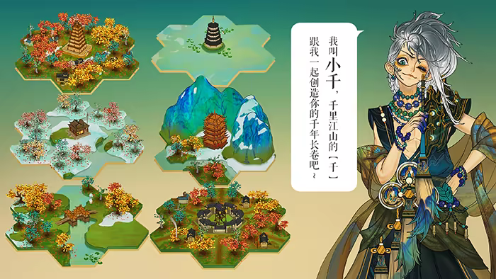 玩家将与小千一同启程拜访中华美景与诗词古典,重新获得灵感再绘一幅当代的千里江山图。