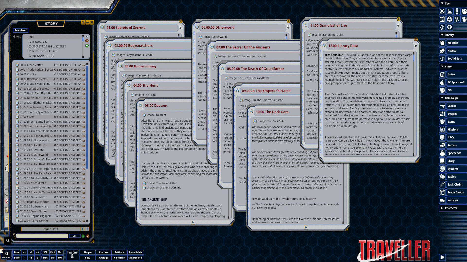 A complete campaign of truly epic proportions, Secrets of the Ancients delves into the dark past of the Charted Space universe, and the legacy of a race of incredibly advanced and powerful aliens. Over the course of this campaign, the Travellers will see sights no human has ever dreamed of, meddle with powers beyond understanding, clash with secret factions within the Imperium, and ultimately help shape the destiny of all Charted Space.
