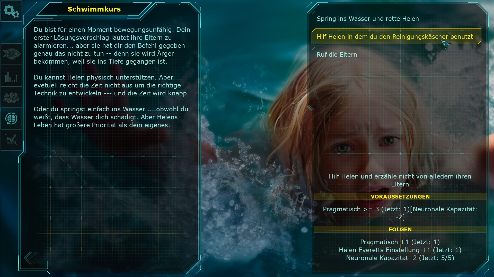Frustriert, weil Du nur einen Schritt (oder besser, einen Skill-Punkt) von der Möglichkeit eine passendere Entscheidung zu treffen entfernt warst? Hier nicht – Alices neuronale Kapazität ermöglicht es dir, in Situationen, in denen Deine Charaktereigenschaften noch unterentwickelt sind, schwierige Entscheidungen zu treffen. Sieh es als eine Art Reservetank, ist dieser leer, also die neuronale Kapazität ausgereizt, kann sie Dir nicht mehr aus der Patsche helfen.