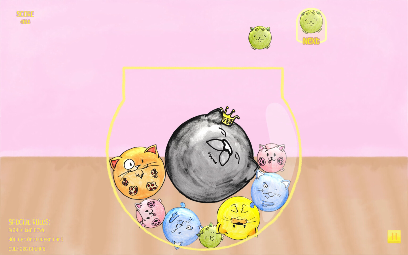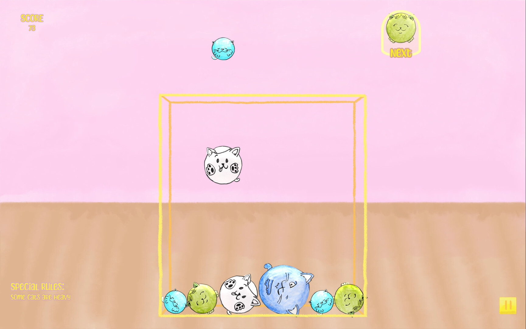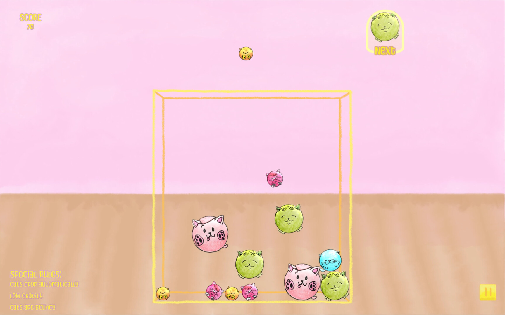 In classic mode you can play the classic suika/watermelon experience. You drop a cat and, if the cat touches another cat of the same size, they will merge into a larger cat. Try to create the biggest cat possible but, if the cats reach the limit of the container, it will be game over.