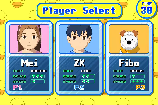 Players can shoot freely in 8 directions. Holding down the shot button locks the direction while moving. The water gun shots lose damage over distance, though. So getting close to enemies does more damage.