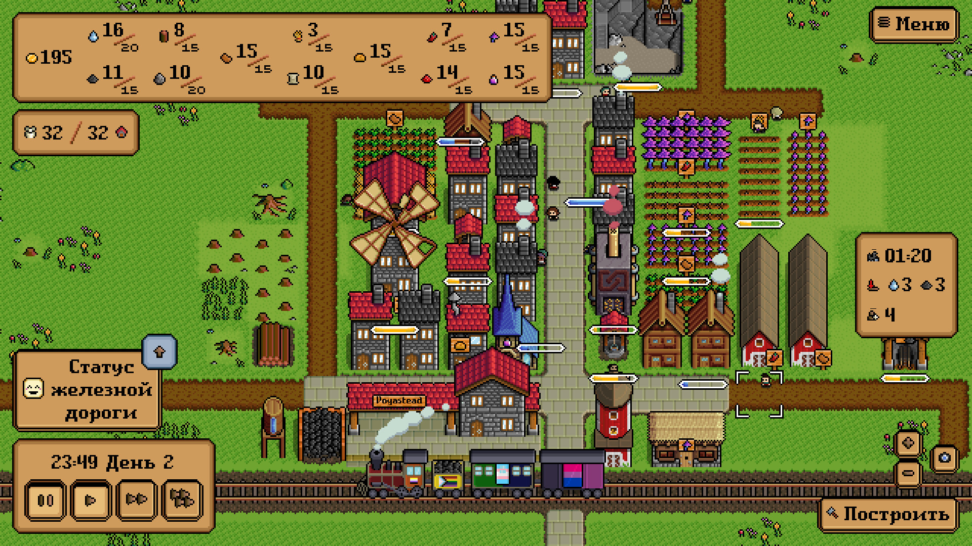 С помощью вашей железной дороги стройте дома, фермы, склады и многое другое, чтобы создать свою деревню. Торгуйте ресурсами и золотом, чтобы превратить деревню в город, а железную дорогу — в мощную транспортную систему.
