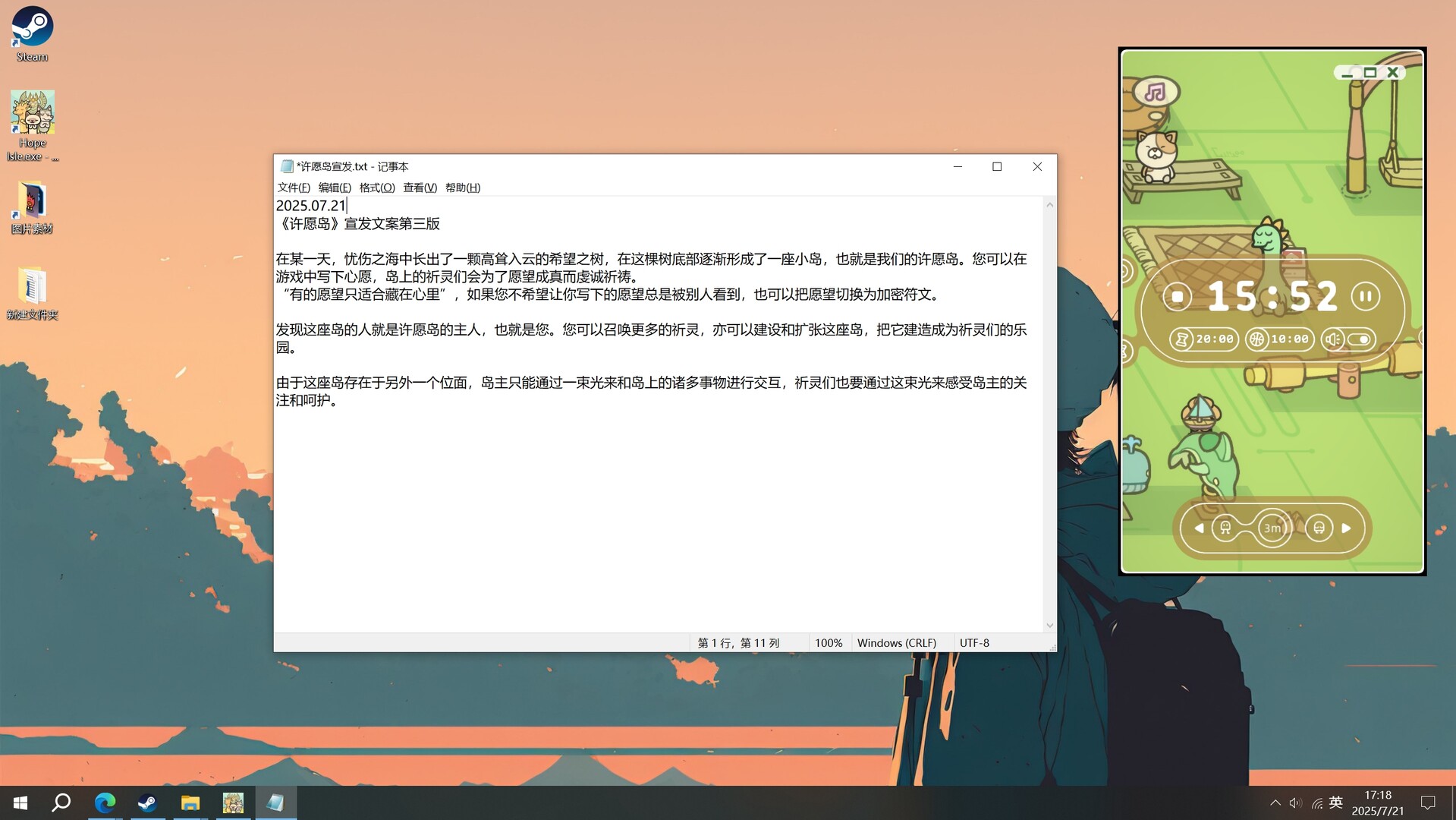 在某一天,忧伤之海中长出了一颗高耸入云的希望之树,在这棵树底部逐渐形成了一座小岛,也就是我们的许愿岛。您可以在游戏中写下心愿,岛上的祈灵们会为了愿望成真而虔诚祈祷。