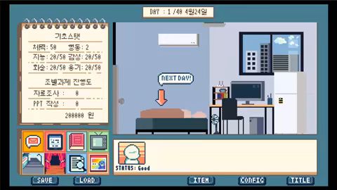 In the simulation part, you can raise various statistics in preparation for the group project.