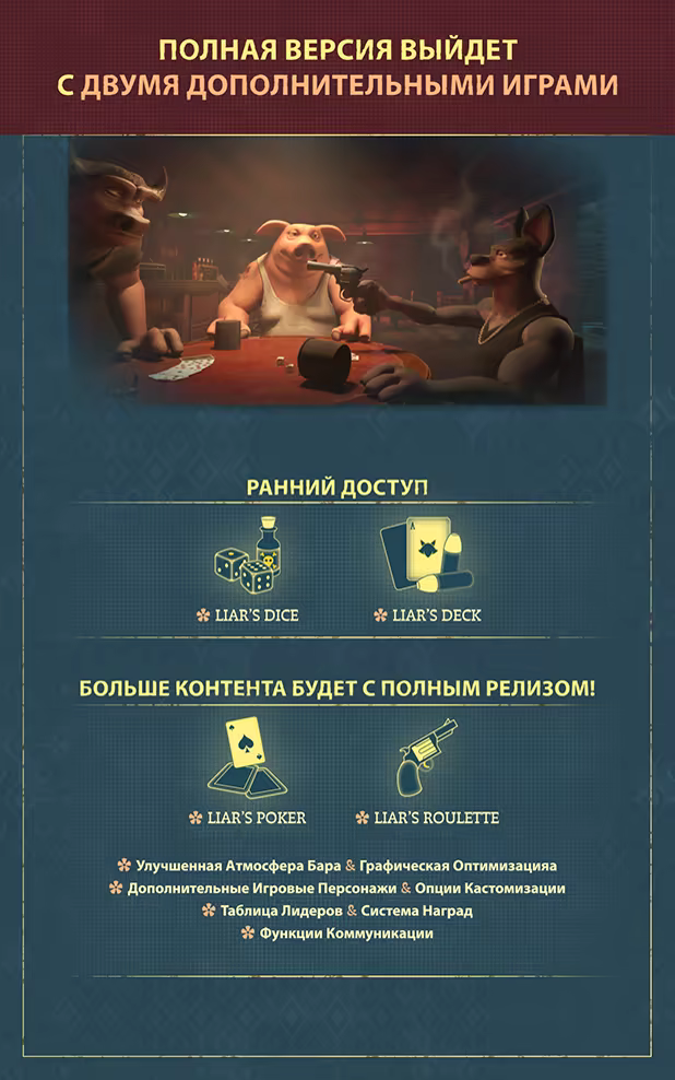 «В режиме раннего доступа вы можете играть в Liar's Dice и Liar's Deck, выбирать уникальных персонажей и погружаться в многопользовательский игровой процесс. Это основа того, что нас ждет впереди.»