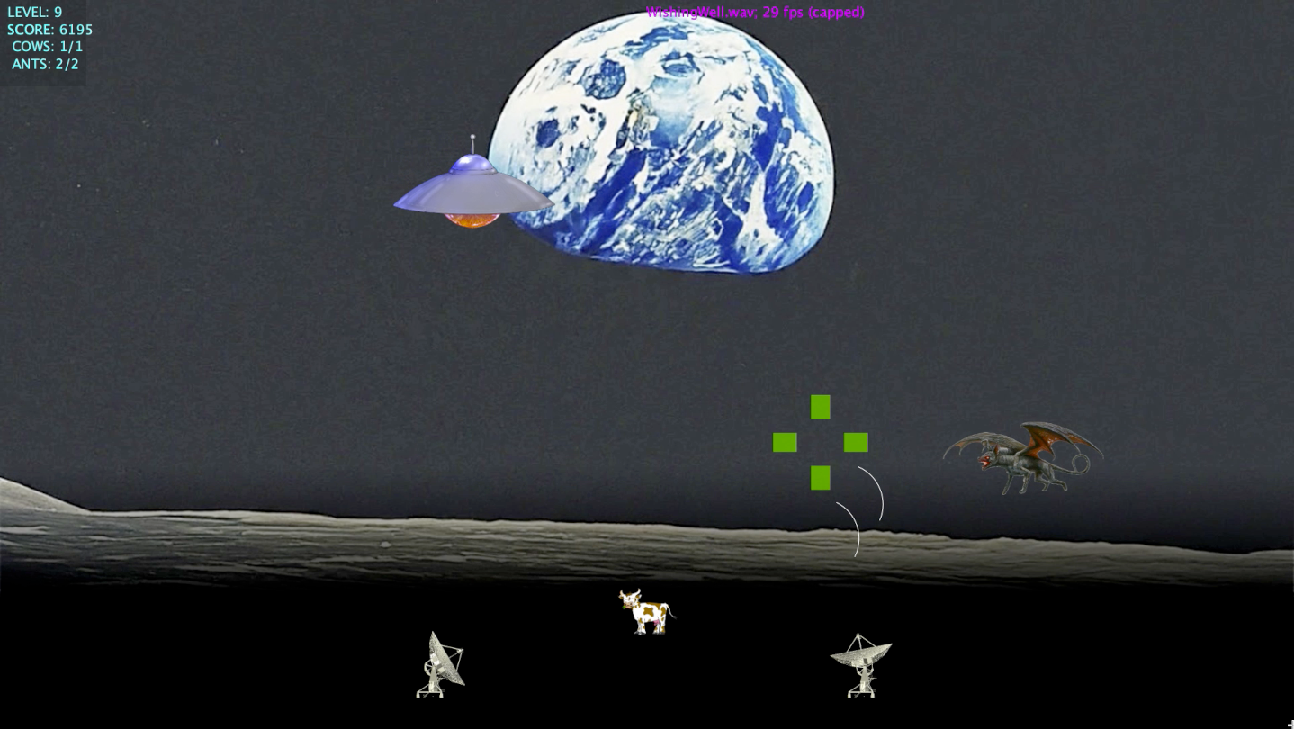 Knowing cows to be more intelligent than humans, the aliens seek to abduct as many cows as possible. Due to the VLA's special relationship with the cattle rancher, allowing all of the rancher's cattle to be abducted would be disastrous for your employer, the National Radio Ablation Office (NRAO). Ablate the aliens before they can abduct all the cows! Also, look out -- the alien ships pack devastating laser cannons that can melt your antennas within a few seconds. Kill the attacking ship before your antenna melts, and your antenna will eventually cool back down.