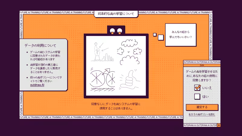 ゲーム終了時に、プレイヤーは自分の描いた絵をこのゲームのAIの学習に使用することに同意するか、しないかを選択できます。これにより、ゲームがどのように発展していくかを決めることができます。世界中のプレイヤーが協力することで、多様な文化固有の絵の解釈における大規模AIモデルの偏りや盲点を明らかにすることができます。