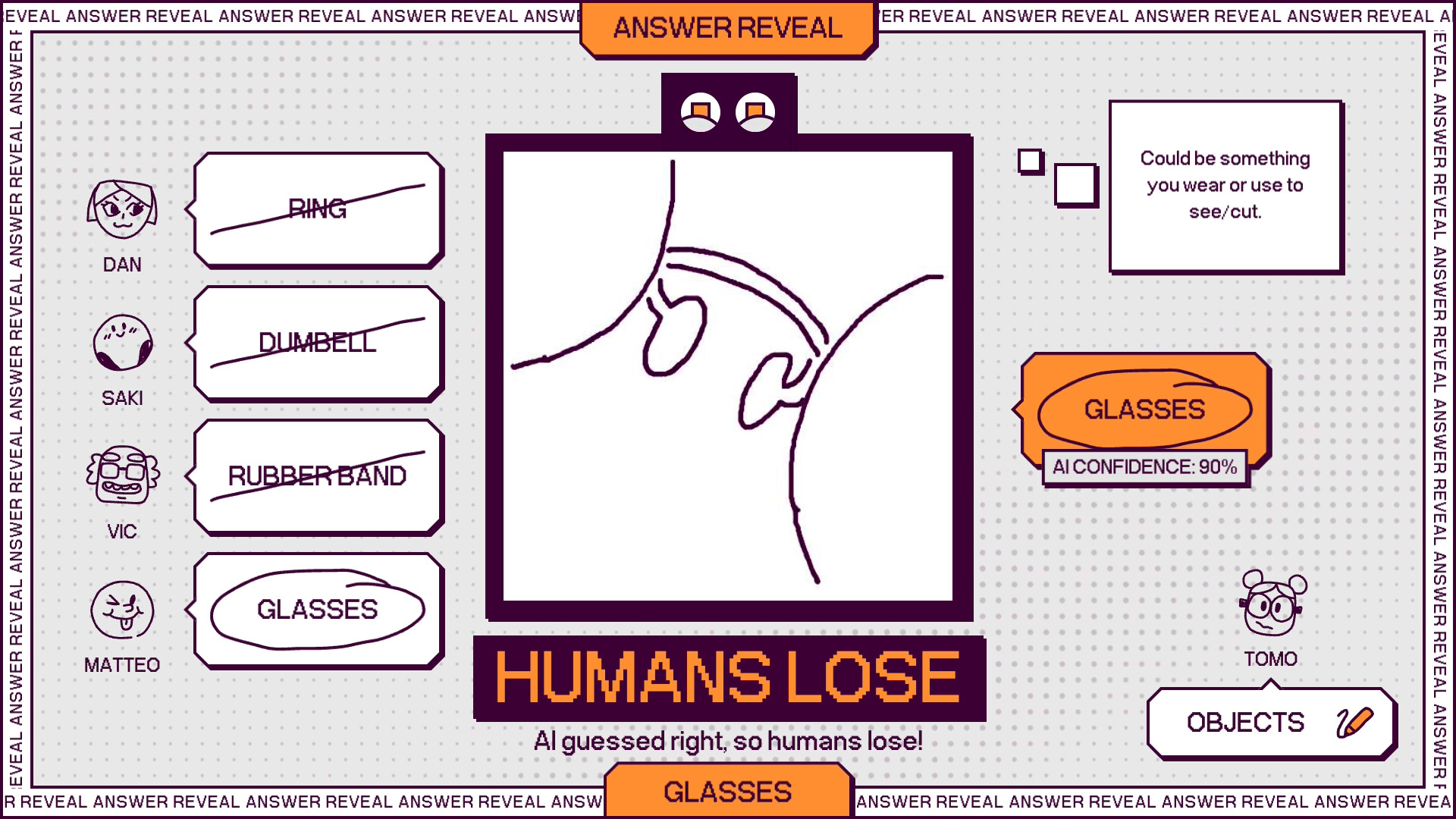 A: In each round, the AI will return numerous guesses, depending on the number of players in the game. If one of those answers are correct, AI wins!