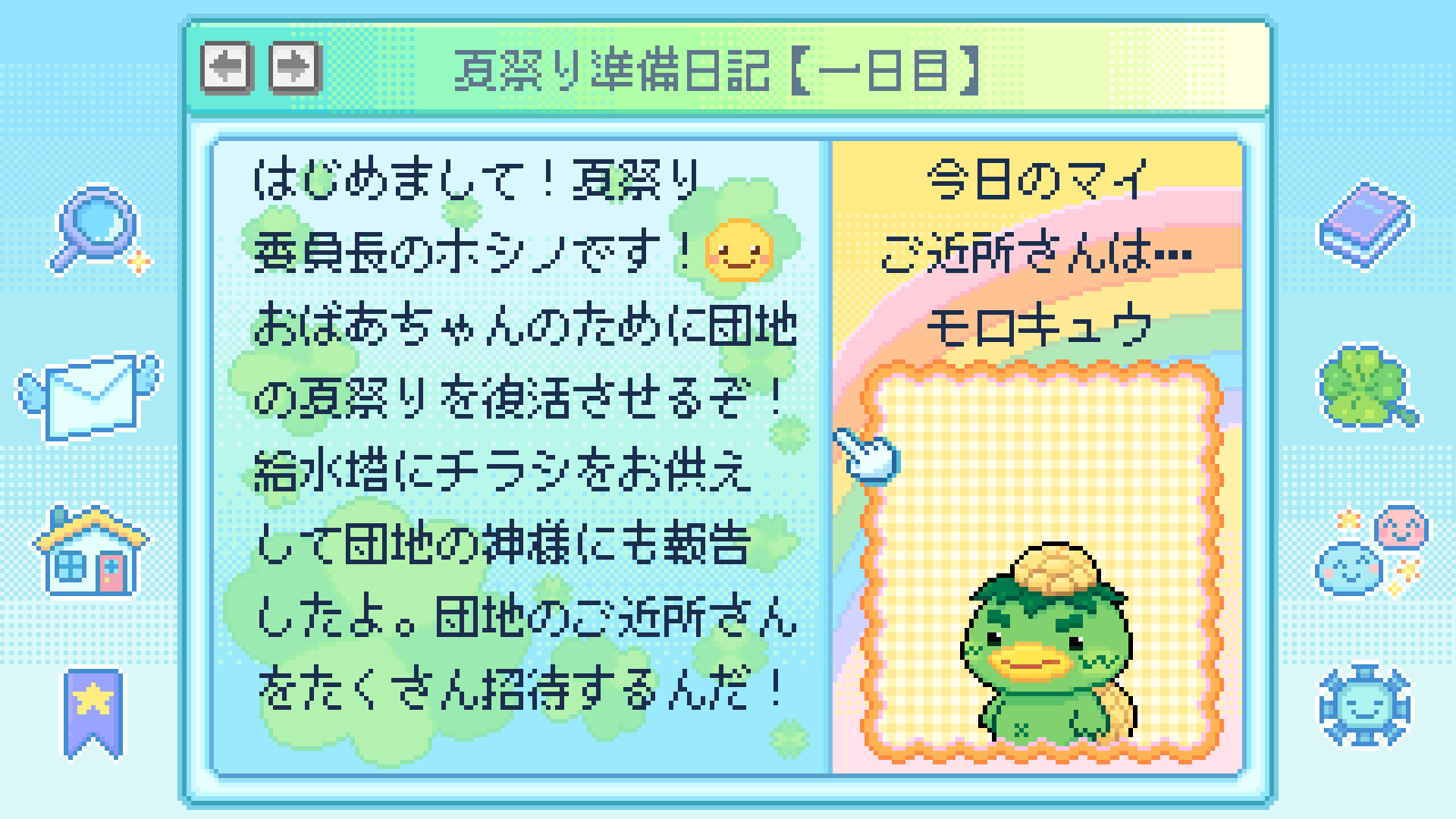 ホシノは、団地のあちこちで出会うめんどくさくも愛おしいご近所さん達を夏祭りに招待していく。悩みを聞いて解決したり、一緒にミニゲームをしたりして距離を縮めることで、夏祭りの参加者は増えていく。ネット上のご近所さんのホームページを訪ねてつながることも。章が進むごとに出会う物語のキーとなる人物たちは、ホシノに新たな世界を見せてくれる。