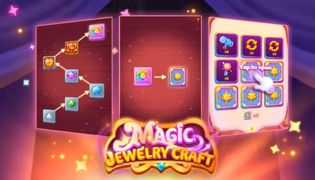Magic Jewelry Craft (MaJew) is a casual puzzle game where you merge gems to level up, unlock treasures, and achieve high scores. Merge three gems of the same tier to advance through 7 tiers. Complete sections to open treasures and earn rewards.