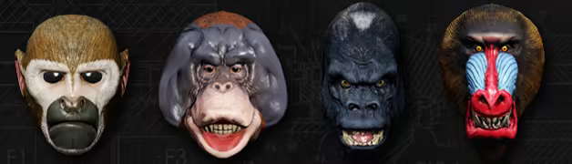 Four new masks – Any career criminal worth his rap sheet will tell you that it is all about first impressions, and there's only one chance to make that first impression. Make sure you send the right signals by using either Rutger the motherfucking orangutan, Clint the black-capped squirrel monkey, John the mandrill or Steven the silverback gorilla.