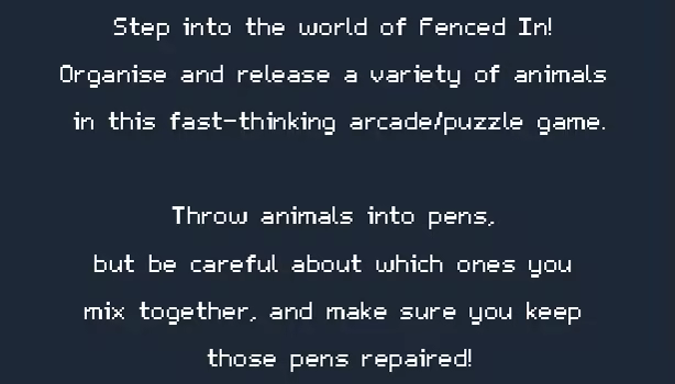 An arcade-puzzle game inspired by Zoo Keeper, Fenced in has you managing 10 different animals into 4 pens, making sure carnivores don't eat herbivores and filling up the pens as much as possible to get the highest score possible!