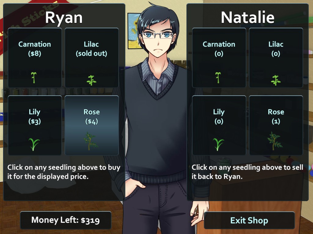 The Flower Shop: Winter In Fairbrook is a dating and farming simulation game and takes place after the first Flower Shop game, Summer In Fairbrook. Play as Natalie this time, and meet some of the characters of the first game like Clara, Susana, Steve, Trent, Jacob plus a "new entry": Ryan, who runs the general store of the town.