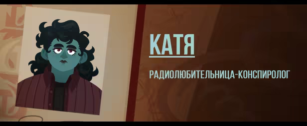 • Безработная радиолюбительница 18 лет. Живет с матерью Раей. Катя из семьи ученых. Ее мать - химик, старший научный сотрудник в НИИ города М. Отец, Сергей, был талантливым радиофизиком, привившим Кате интерес к радио еще в детстве.