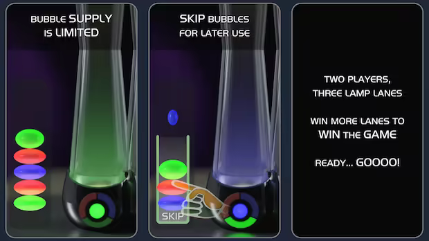 On the spectrum between Pong and Puzzle Bobble - and infused with elements of classic games such as Tug-of-War, Simon, Bowling, and Rock Paper Scissors - That Lava Lamp Game is a fiercely competitive lane-based bubble shooter designed for two players.