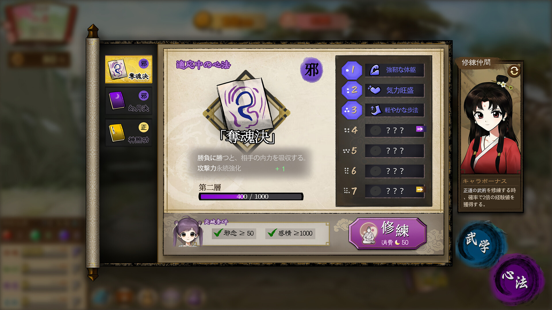 • 多岐にわたる武学:正道も、邪道も。師匠から学ぶ正統な武学も、夜陰に乗じてこっそり覚える技も、娘の力になります!