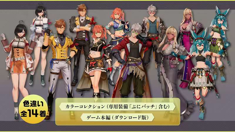 ユミア、フラミィ、ヴィクトル、アイラ、ルトガー、ニーナ、レイニャのアナザーカラーのコスチューム(各キャラクター2着ずつの全14着)と、装飾品「ぷにバッチ」3個と「ぷにバッチ」のレシピのセット。