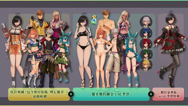 ※含有遊戲本篇或相同內容的其他產品亦正販售中。除去組合特典,季票與季票所含內容可於日後單獨購買,請留意避免重複購買。此外,於單獨購買時,②~⑧、⑨~⑮所包含之優米雅與芙拉米的服裝,只能以組合的形式購買(無法只購買優米雅或芙拉米的服裝)。