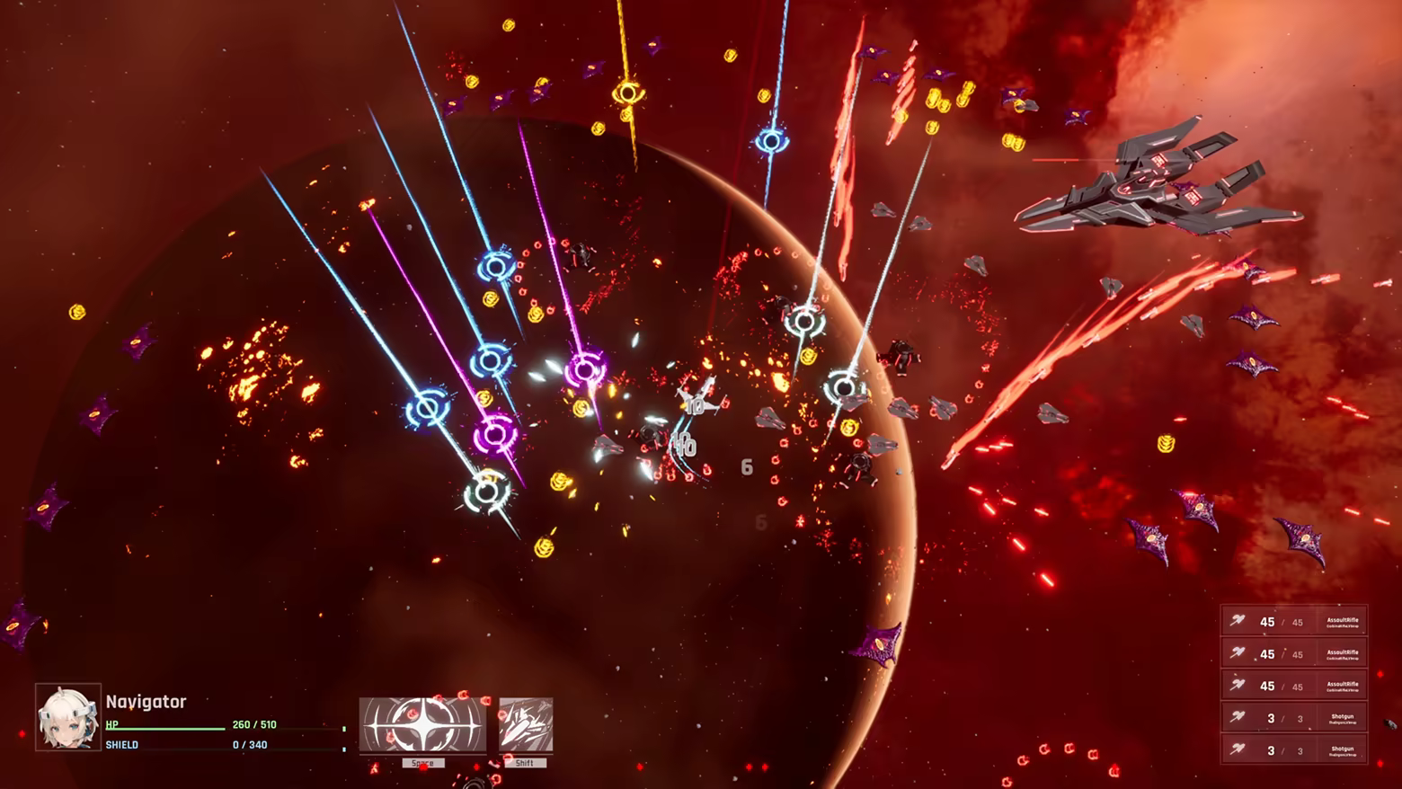 The game features dual joystick controls, a top-down bullet-hell shooter gameplay, and roguelike loot-hunting gameplay. Hundreds of buffs, weapons, and special skills are freely available for combination. It supports four-player multiplayer mode. By cultivating different characters called "Navigator", players improve their skills and unlock dozens of Live2D animated characters and interactive plots.