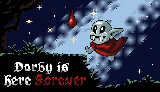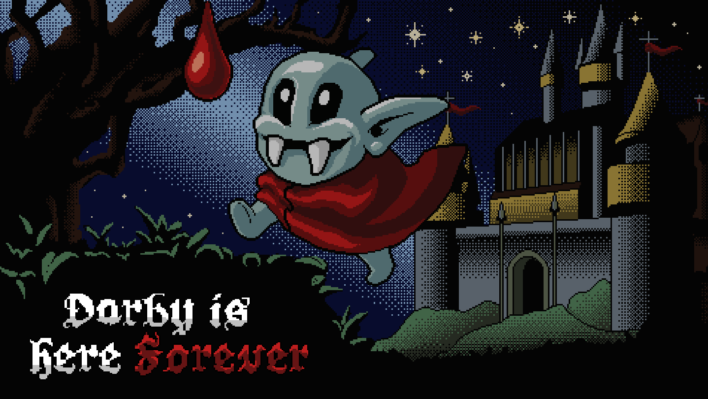 Darby Is Here Forever is an adventurous and challenging platformer where you control a little vampire named Darby who has escaped from what was his home, and seeks to reclaim it from the claws of the Demon King, a selfish and greedy guy who has no problem about conquering, hunting or polluting to fill his pockets with gold.