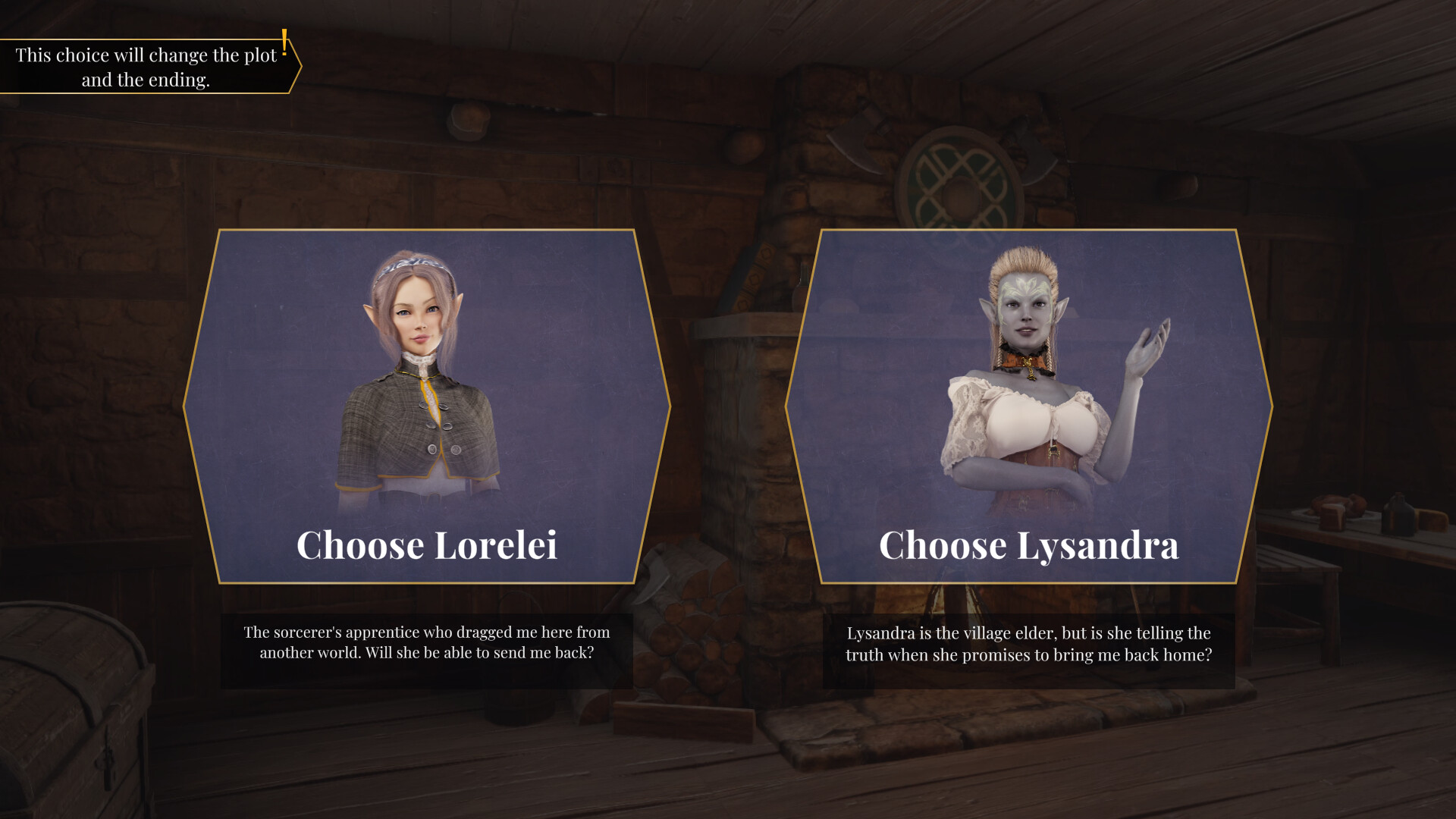 Would you leave with Lorelei to go on an adventure looking for a way to get you back, or stay in the village with its leader, Lysandra, who’s accused of using dark magic? Who can you trust and what choice will lead you home? Who’s trying to help, and who just wants to use you for their own purposes? Play and find out!