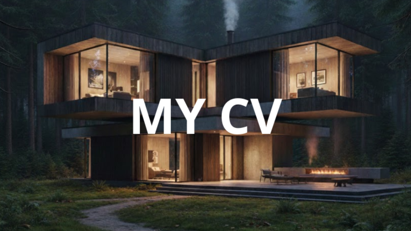 My CV is a first-person interactive experience set in a quiet modern home deep in the woods. Inside the house, the walls tell a story — framed projects, sketches, and handwritten notes replace traditional menus and resumes.