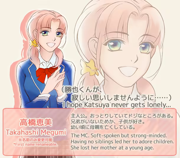 MY DEAR☆LOVE is a crossover between visual novel and stat-raising simulation game. You play as high school girl Megumi Takahashi (first name renameable) who takes on the task of taking care of kindergartener Katsuya, the little nephew of her crush, Atsuya Suzuki!