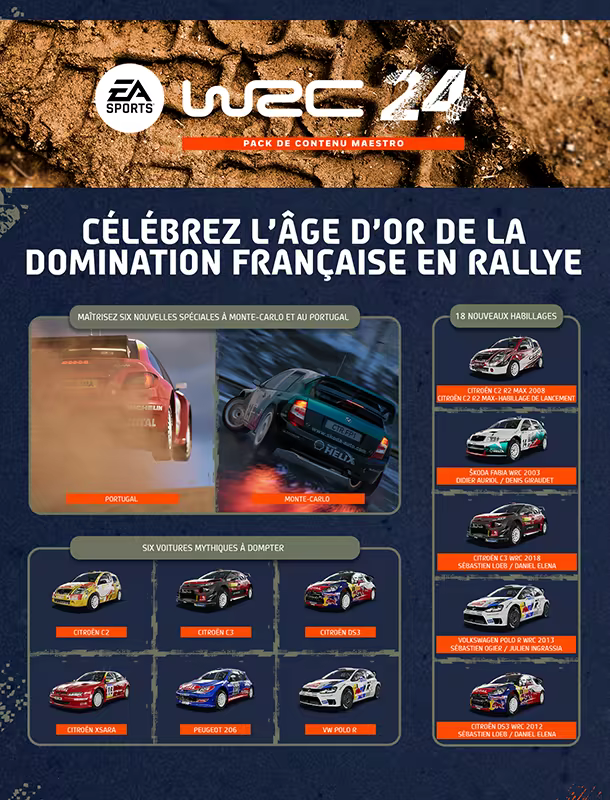 Achetez le pack de contenu Maestros pour EA SPORTS™ WRC 24 et plongez dans une ère dorée du rallye avec ce pack, véritable hommage à la domination française entre la fin des années 1990 et les années 2010. Profitez de 6 spéciales ajoutées à Monte-Carlo et au Portugal, de sept voitures classiques à piloter et d’habillages mythiques.