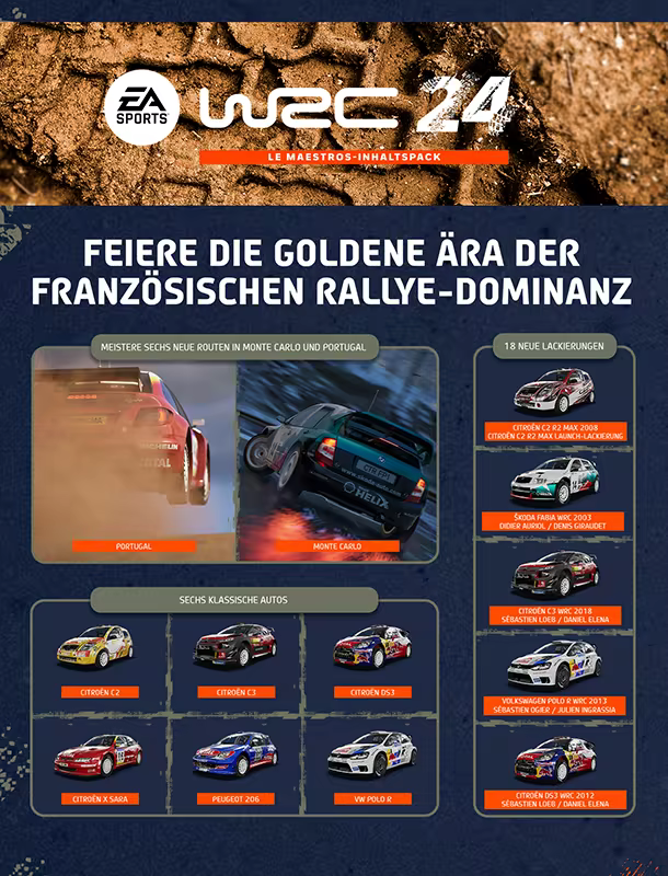 Kaufe das EA SPORTS™ WRC 24 „Le Maestros“-Inhaltspaket und tauche ein in die goldene Ära des Rallye-Rennens. Das „Le Maestros“-Paket ist ein Tribut an die berühmte Ära der französischen Dominanz, die in den späten 1990ern begann und bis in die 2010er anhielt. Monte Carlo & Portugal werden um 6 Strecken bereichert, zudem gibt es sieben klassische Autos und ikonische Lackierungen.