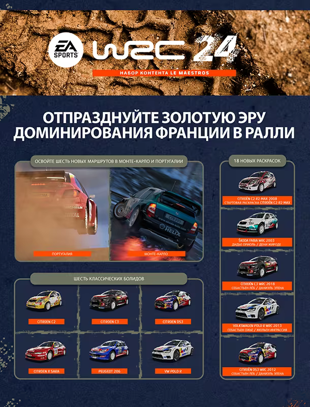 Купите набор контента Le Maestros для EA SPORTS™ WRC 24 и погрузитесь в золотую эпоху ралли. Набор Le Maestros отдает дань уважения французскому лидерству в ралли с конца 1990-х до 2010-х. Добавлено 6 трасс в Монте-Карло и Португалии, семь классических машин и культовые раскраски.
