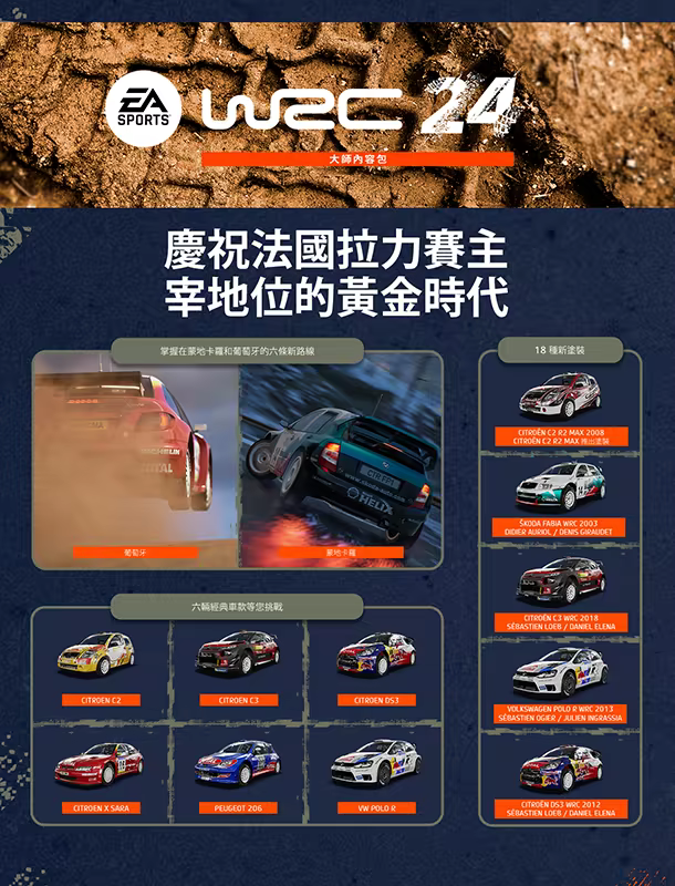 購買《EA SPORTS™ WRC 24》Le Maestros 內容包,躍入拉力賽的黃金時代,向 1990 末至 2010 由法國稱霸的代表性年代致敬。蒙地卡羅和葡萄牙增加了 6 個賽段,同時學習精準操控 7 輛採用具標誌性塗裝的經典車款。