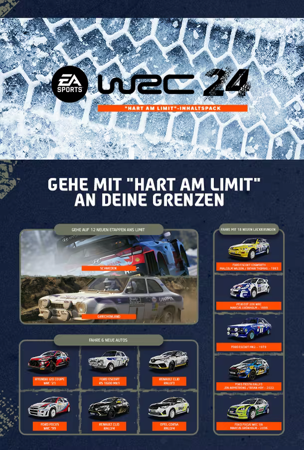 Kaufe das EA SPORTS WRC 24 "Hart am Limit"-Inhaltspack und erlebe die Essenz des Rallyesports. Gehe mit 6 neuen Etappen in Schweden und Griechenland, 6 neuen legendären Auto-Klassikern, 18 neuen Lackierungen und 16 exklusiven Moments an deine Grenzen.