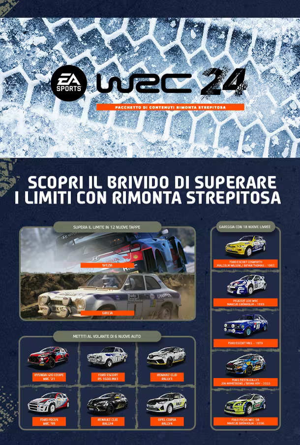 Acquista il pacchetto di contenuti Rimonta strepitosa di EA SPORTS WRC 24 per vivere l'essenza del rally. Spingiti al limite in 6 nuove tappe in Svezia e in Grecia e scopri 6 nuove leggendarie vetture classiche, 18 nuove livree e 16 momenti esclusivi.