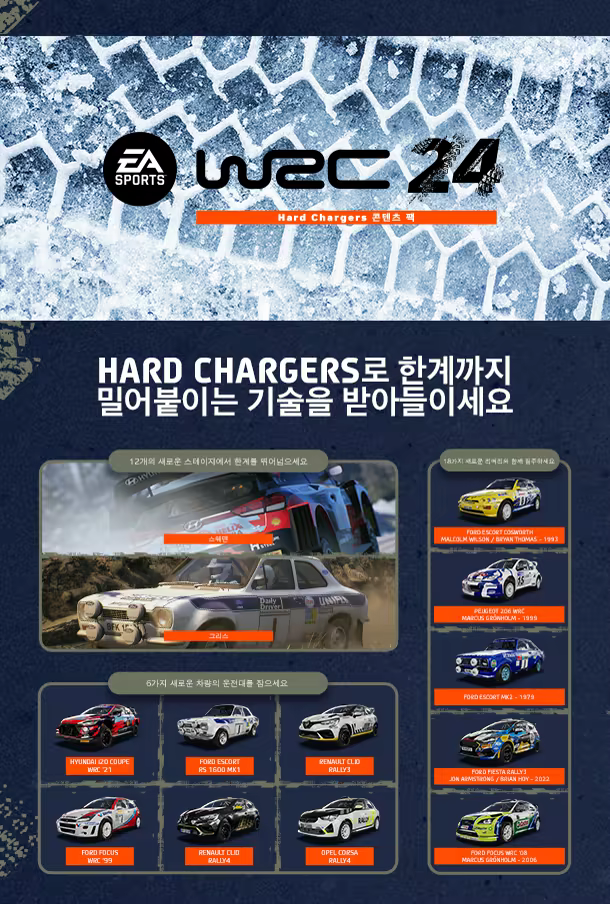 EA SPORTS WRC 24 Hard Chargers 콘텐츠 팩을 구매하여 랠리의 본질을 경험해 보세요. 스웨덴과 그리스의 6가지 신규 스테이지, 전설적인 신규 클래식 차량 6대, 18가지 신규 리버리, 16가지 특별한 순간으로 한계에 도전하세요.