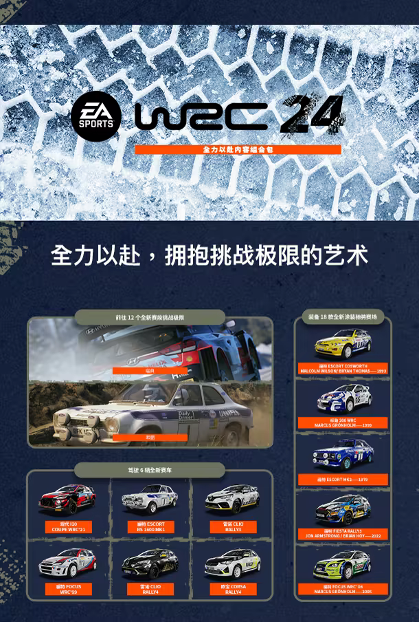 购买《EA SPORTS WRC 24》全力以赴内容组合包,体验拉力赛精髓。前往位于瑞典和希腊的 6 个全新赛段挑战极限,享受 6 款全新经典传奇赛车、18 款全新涂装和 16 个专属时刻。