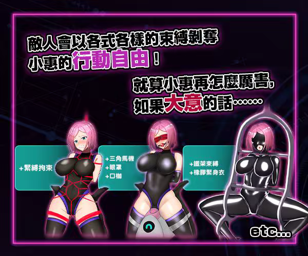 身穿緊身衣的女主角小惠,將在戰鬥中被各種裝置束縛,遭受色色的玩具和性騷擾攻擊所凌辱!