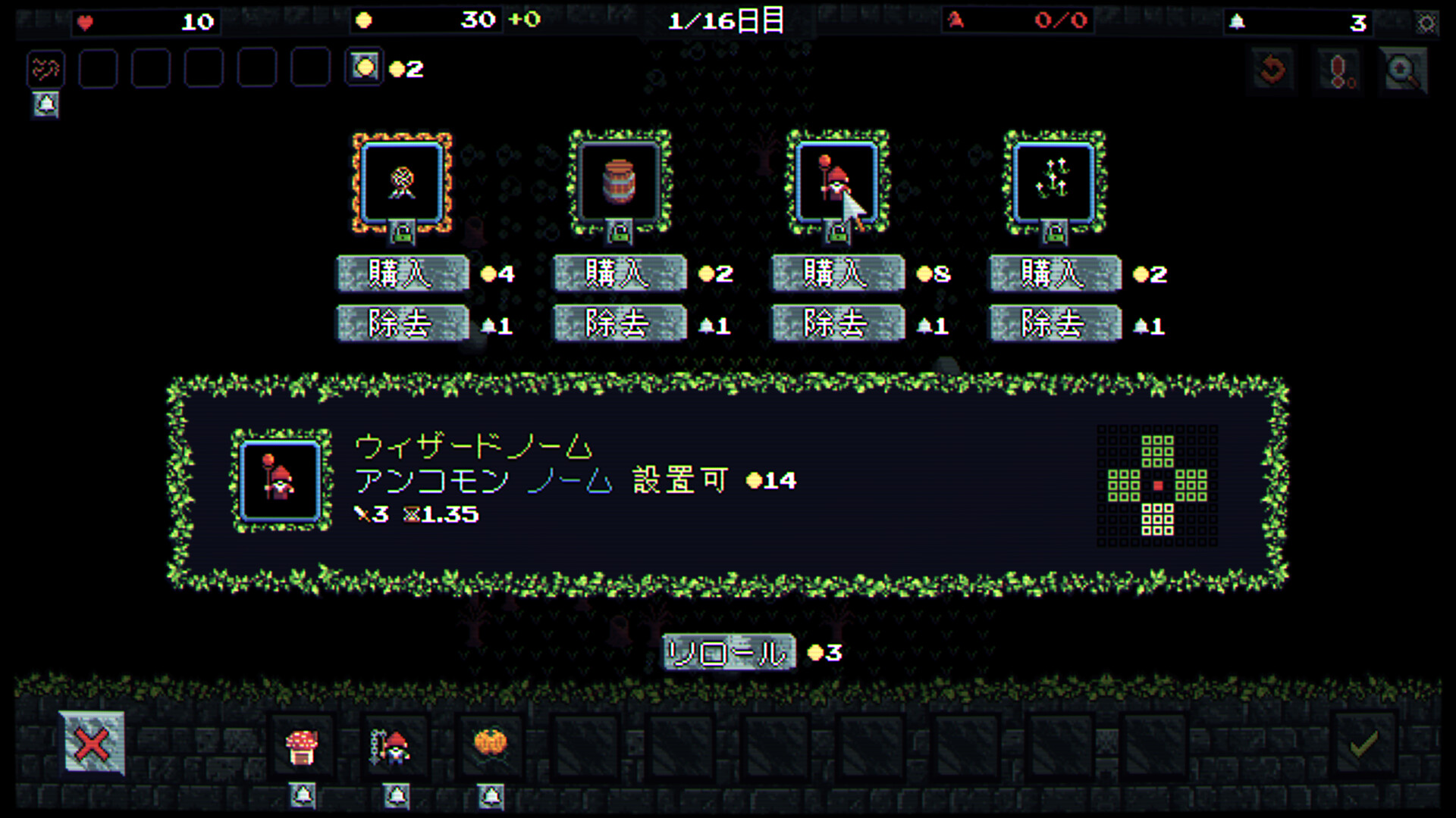 各ターン、ノームユニットを自由に移動させ、防衛施設や作物を配置して夜のゴブリン侵攻に備えよう。遭遇戦ごとに戦略と資源管理の両方が試される。特殊作物を栽培し、機能性建物を建設し、ゴールドで強力な遺物を購入して、独自の戦術体系を構築せよ!