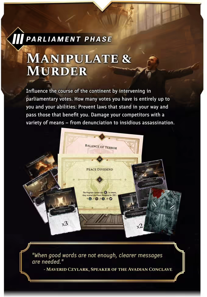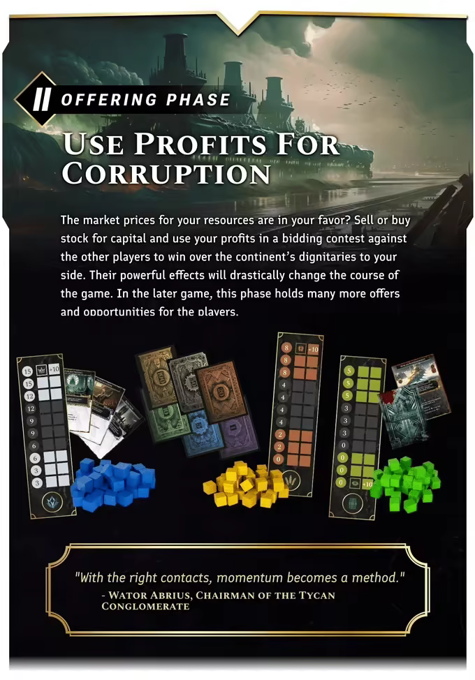 In SYNCANITE FOUNDATION, you take on the role of a unique oligarch and plan your coup from the shadows to take over the world. While doing so, you need to eliminate your rivals by using military force in the 1st, asymmetric area control phase; economic means in the 2nd, resource management phase and political pressure in the 3rd phase, in which you pass laws that add new rules and eventually trigger one or multiple crisis. Each of these unlocks a new game mechanic and thus opens a path to victory. Its core version is for 2-4 players and lasts 30-45 mins per player. The expansion is for 1-6 players.